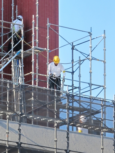 基本は力仕事となります。鉄のあの重い部材を軽々と持ち運び、組み立てていく様は見ていて圧巻です。組み立て時、解体時どちらも不安定な高所での作業となるため一番危険性が高いかもしれません。